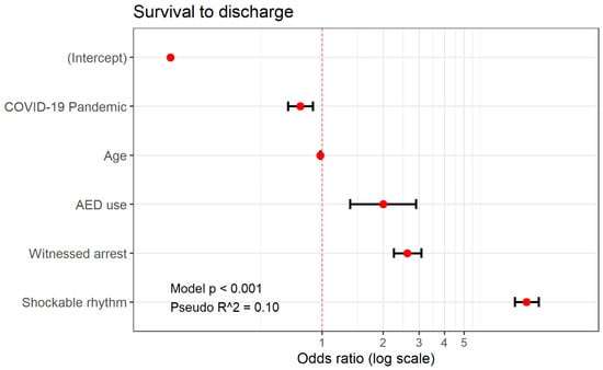 Regarding the factors that affected the survival to discharge of patients who suffered OHCAs in public places, shockable rhythm was the most influential variable after adjusting for variables (odds ratio (OR), 10.12; 95% confidence interval (CI), 8.85–11.59, p < 0.001), followed by cardiac arrest due to disease and use of bystander AED (OR, 2.00; 95% CI, 1.37–2.90, p < 0.001). The period to the COVID-19 pandemic was associated with low survival to discharge (OR, 0.78; 95% CI, 0.68–0.90, p < 0.001) (Table 4 and Figure 3).