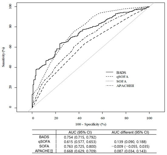 The prediction power of BADS was compared with that of qSOFA, SOFA, and APACHE II and generalized through cross-validation (Figure 3). The average AUC was 0.754, 0.615, 0.763, and 0.668 for BADS, qSOFA, SOFA, and APACHE II, respectively. The AUC of BADS was higher than that of qSOFA (AUC difference, 0.139; 95% CI, 0.090–0.188) and APACHE II (AUC difference, 0.087; 95% CI, 0.034–0.143), and the difference was statistically significant for qSOFA. Compared with the SOFA, the prediction power of BADS was low but not statistically significant (AUC difference, −0.009; 95% CI, −0.055–0.035).