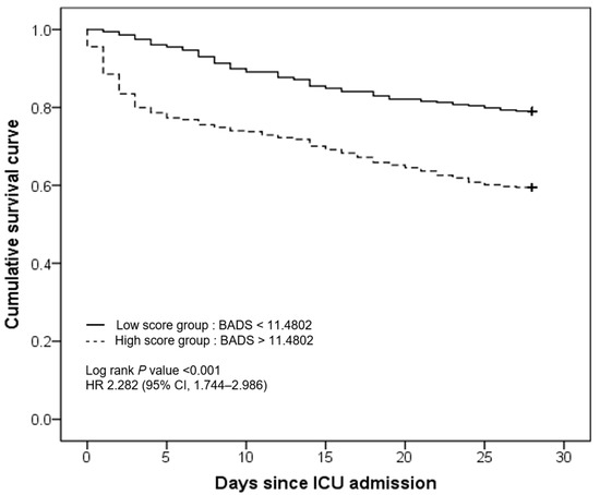 We set the cut-off score of sepsis diagnosis as 11.4802 (sensitivity, 0.634; specificity, 0.765). Then, the mortality was compared between the low- and high-score groups based on this cut-off score (Figure 4). As the total points of BADS increased, the 28-day overall mortality also increased, and this result was statistically significant (hazard ratio, 2.282; 95% CI, 1.744–2.986; log rank p < 0.001) (Figure 4).