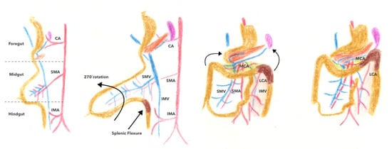 During embryonic life, the digestive system develops from the primitive intestine, which is composed of three parts according to its extent: from the oral cavity to the duodenum, including the liver, bile ducts, and pancreas (anterior primitive intestine); from the terminal part of the duodenum to the proximal 2/3 of the transverse colon (middle primitive intestine); and from the distal 1/3 of the transverse colon to the anal canal through division of the cloacal region (posterior primitive intestine). The primitive midgut elongates rapidly during the first 6 weeks of development to give rise to the primitive bowel loop, which continues to develop partially into the umbilical cord and forms a physiological hernia. Two successive rotations occur at the level of the primitive intestinal loop between the 8th and 10th weeks of development in an anti-clockwise direction (270°) around an axis formed by the superior mesenteric artery (SMA): a first rotation of 90° followed by a second rotation of 180°, allowing the reorganization of the digestive tractus and their integration into the abdominal cavity. After this rotation, the mesos of the transverse colon and the descending colon partially fuse together. The anterior sheet of the transverse mesocolon fuses with the posterior wall of the greater omentum, and the posterior sheet of the descending mesocolon fuses with the retroperitoneal wall [13]. The left colonic angle (LCA) then forms and attaches to the lower pole of the spleen and is located at the border between the structures originating from the primitive midgut and those originating from the primitive hindgut (as shown in Figure 1). The SMA vascularizes the primitive midgut, while the inferior mesenteric artery (IMA) vascularizes the primitive hindgut, respectively. The respect of these embryological planes is essential in the surgical technique of the total removal of the mesocolon for colon cancer [14].