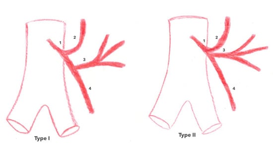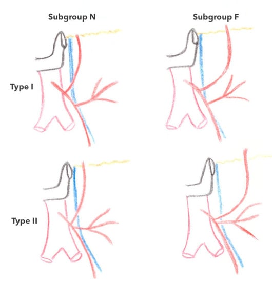 Concerning the ACSG, several classifications have been described according to its mode of birth on the IMA along with its place and relationship with the inferior mesenteric vein (IMV). Latarjet’s classification [17] separates type I (71% of cases), in which the ASCG and the sigmoid trunk arise separately from the IMV from type II (29% of cases), in which the ASCG and the sigmoid trunk arise from a common trunk of the IMV (Figure 4) [1,18]. Patroni et al. [19] considered the distance between the birth of the ASCG and the IMV at the inferior border of the pancreas (Figure 5) and distinguished subgroup N (66% of cases) if the distance between the two vascular elements was >2 cm and subgroup F (34% of cases) if the distance was <2 cm, respectively. Finally, Miyake et al. individualized four types according to the position of the ACSG in its course to the left colonic angle in relation to the IMV. In type A, the ACGS travels medially to the IMV; in type B, the ASCG is just lateral; in type C, the ASCG is frankly lateral to the IMV; and in type D, the ASCG is absent (as shown in Figure 6) [18].