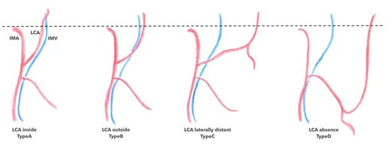 Miyake and al classification 2018. LCA (left colic artery) type A; LCA outside Type B; LCA laterally distant Type C; LCA absence Type D.