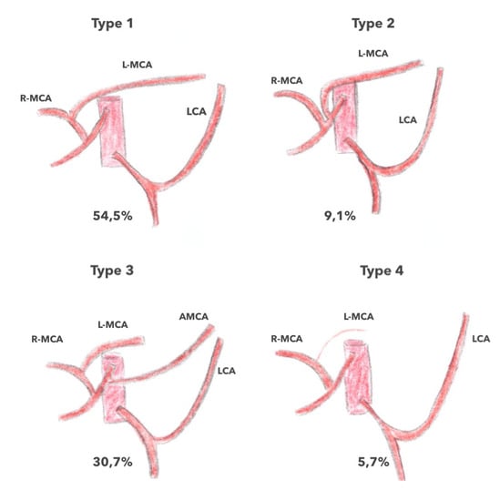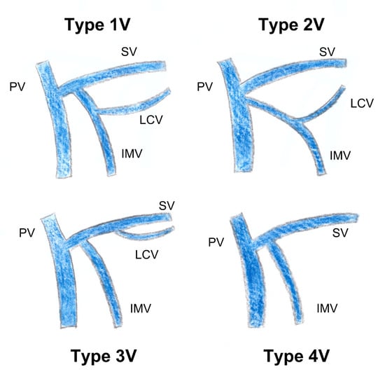 In contrast to studies on arterial vascularization, there is little data available regarding the specific venous drainage of the left colonic angle. Using preoperative 3D CT in 66 colorectal cancer patients, Arimoto et al. [28] characterized the anatomy of the IMV. In this study, the IMV drained directly into the splenic vein in 48.5% of cases, into the MSV in 40.9% of cases, and at the confluence of the two veins in 10.6% of cases, respectively. Additionally, a left colonic angle vein was identified that emptied into the MIV in 93.9% of cases, into the splenic vein in 3.0% of cases, and into the middle colonic vein in a further 3.0% of cases (Figure 2). This junction in the IMV was located below the inferior border of the pancreas in 90.6% of cases and above in 6.3% of cases, respectively. Considerations of the confluence pattern of the IMV could be useful for the safe mobilization of the left colonic angle; the IMV serves as an oncologic landmark in left colonic angle cancer. In Iguchi’s study [1], which evaluated the preoperative vascular anatomy in 96 patients with left colonic angle cancer, a left colonic angle vein was identified in 75% of these patients draining into either the splenic vein or the IMV. The authors therefore proposed a classification consisting of four types (Figure 10). In type 1 (52.1% of cases), the left colonic angle vein drains into the IMV, which then joins the splenic vein; in type 2 (19.8% of cases), the left colonic angle vein drains into the IMV, which then joins the SMV; in type 3 (3.1% of cases), the left colonic angle vein drains directly into the splenic vein; and finally, in type 4 (25%), the left colonic angle vein is absent (Figure 11) [1]. In a recent study by Murono et al. [20], the anatomy of the MCAA and the left colonic angle vein was assessed in 205 patients with colorectal cancer using AngioScan(General Electric Medical Systems, Milwaukee, Wisconsin, USA). A proper left colonic angle vein (LCVA) draining into the IMV was identified in 86.3% of cases, tracing in a total of 95.5% of cases to the inferior border of the pancreas. In this study, the ACSG was the main artery accompanying this vein in 42.4% of cases, followed by the AMCA in 32.7% of cases; no arteries accompanied the vein in 7.8% of cases, respectively. These results suggest that in cases of carcinologic resection of the left colonic angle for cancer, the IMV should be dissected and then tied above the left colonic angle vein outlet, allowing for the resection of the entire length of the corresponding AMCA [20]. Whether central ligation of the MCAA and IMV is even necessary if these vessels are concealed on the dorsal aspect of the pancreas has not been completely elucidated [20]. Indeed, the origin of the MCAA as well as the termination of the IMV and the left colonic angle vein were located behind the pancreas in 20.2%, 31.7%, and 3.9% of cases, respectively.