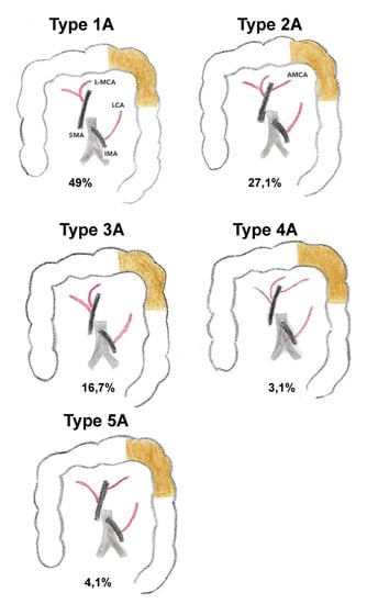 Considering these anatomical variations, Tanaka et al. [16] recently proposed a classification of the arterial vascularization of the left colonic angle into four types based on preoperative imaging. In type 1, vascularization is provided by the left branch of the ACM originating from the common trunk and the ACSG (n = 48; 54.5%); in type 2, vascularization is provided by the left branch of the MCA of an independent origin and the ACSG; in type 3, vascularization is provided by the AMCA and the ACSG; and in type 4, vascularization is provided by the ACSG alone. According to this study, which included only 88 patients, the prevalence was 54.5% for type 1 (54.5%), 30.7% for type 3 (30.7%), 9.1% for type 2, and 5.7% for type 1, respectively (Figure 8) [16]. In a recent study, Iguchi et al. [1], who included 96 patients with left colonic angle cancer among 1256 colon cancer patients (7.6%), described five types of arterial vascularization of the left colonic angle based on 3D CT imaging. In type 1A (49%), there was a GCA and a left branch of the MCA from a common trunk observed; in type 2A (27.1%), there was a GCA, a left branch of the MCA from a common trunk, and an MCA from the SMA; in type 3A (16.7%), there was an ACSG and a left MCA arising directly from the AMS; in type 4A (3.1%), there was an ACSG, a left MCA arising directly from the SMA, and an AMCA arising from the SMA; and finally, in type 5A (4.1%), there was an ACSG and an AMCA, and the left MCA was absent(Figure 9). Regardless of these classifications, these studies highlight the variability of arterial anatomy and the non-eligible role that the MCAA plays in the vascularization of the left colonic angle, which could have an impact on the surgical strategies to be implemented for left colonic angle cancers [22].