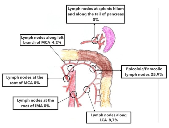 Distribution of lymph node metastasis according to Nakagoe and al. 2021. Lymph nodes at splenic hilum and along the tail of pancreas 0%; epicolic/paracolic lymph nodes 25.9%; lymph nodes along LCA (left colic artery) 8.7%; lymph nodes at the root of IMA (inferior mesenteric artery) 0%; lymph nodes along left branch of MCA (middle colic artery) 4.2%.