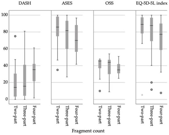 Furthermore, PROMs and HRQoL measures show clear trends towards deterioration in scores with advancing fragment count, especially when considering four-part fractures (see Table 6). Mean DASH score increased with the increase in the number of fragments from two to four. ASES, OSS, and EQ-5D-5L follow the same trend but means reduced with fracture count (see Figure 1).
