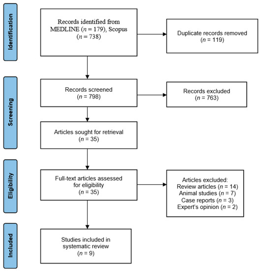We initially found 917 articles from two bibliographic databases based on the search strategy. After screening for duplicates, 798 articles were eliminated for irrelevant content, study design and lack of data. Further 763 articles were excluded after screening the titles and abstracts according to the exclusion criteria, and 35 full-text articles were retrieved and assessed for eligibility. Twenty-six articles were excluded due to insufficient data; fourteen were review articles, seven were animal studies, three were case reports and two were expert opinions. Finally, the selection process yielded nine articles eligible for inclusion in the systematic review (Figure 1).