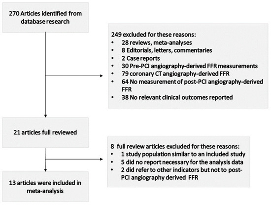 Our initial systematic search of the literature retrieved 270 studies, 13 of which were suitable for the analysis (Figure 1). In total, 249 articles were excluded from this meta-analysis after reading the titles and the abstracts because they were irrelevant to the research purpose. Specifically, 28 studies were systematic review articles, 8 studies were editorials, letters or commentaries, 2 studies were case reports, 30 studies reported the pre-PCI angiography-derived FFR, 79 studies investigated the coronary CT angiography-derived FFR, 64 studies had no measurement of the post-PCI angiography-derived FFR and 38 studies had no relevant clinical outcome reported. Finally, eight articles were excluded after a full review for the following reasons: one study had a population similar to an included study [31], five studies did not report the data necessary for this analysis [16,32,33,34,35] and two did refer to other indicators but not to the post-PCI angiography-derived FFR [36,37].