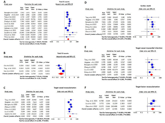 During the follow-up period, the magnitude of risk for TLR in individuals with lower post-PCI angiography-derived FFR values was significantly higher compared with the risk of individuals with higher values. The pooled HR for the lower angiography-derived FFR was 6.27 (95% CI, 3.08–12.79) for TLR (Figure 2F).