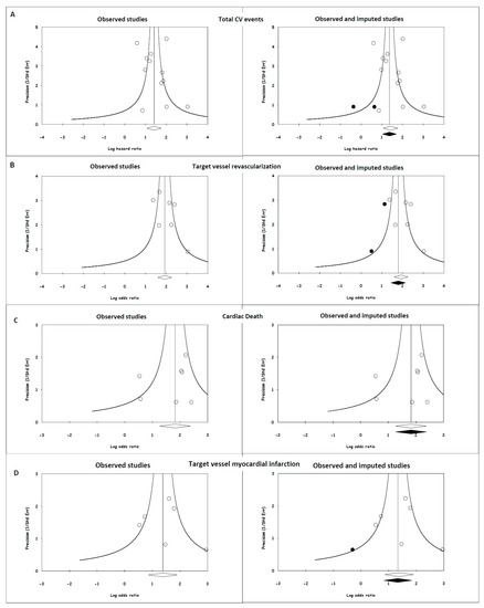 Publication bias for endpoints and their potential effects. (A) Total CV events; (B) target vessel revascularization; (C) cardiac death; and (D) target vessel myocardial infarction. The open circles in the left and right plots depict individual studies relating the lower value of the angiography-derived FFR with cardiovascular events, and the open diamonds are the HR and 95% CI for the meta-analysis. The solid circles in the right side of the figure represent imputed studies, and the solid diamonds are the HR and 95% CI for the meta-analysis after adjusting for publication bias.