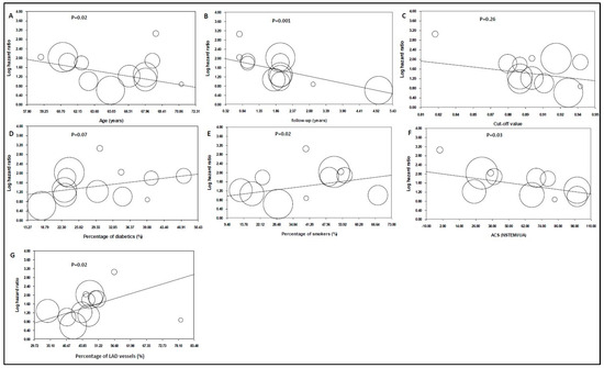 The duration of follow-up was the strongest predictor of the size of the log HR in patients with lower post-PCI angiography-derived FFR values, and it was inversely related to the prognostic role of the post-PCI angiography-derived FFR for total cardiovascular events (p = 0.001, Figure 4B). Age at the enrollment indicated inverse associations with the predictive value of the post-PCI angiography-derived FFR value (p = 0.02, Figure 4A). The cut-off point of the angiography-derived FFR was not a predictor (p = 0.26, Figure 4C), while the percentage of diabetic patients in each study demonstrated a non-statistically significant positive trend (p = 0.07, Figure 4D). The percentage of smokers in each study and the percentage of LAD vessels showed positive associations with the predictive role of the post-PCI angiography-derived FFR (p = 0.02). The percentage of patients with acute coronary syndrome illustrated a negative association with the predictive value of the angiography-derived FFR after PCI (p = 0.03) (Figure 4E–G).