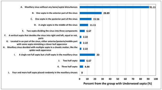 Nelke, K.; Diakowska, D.; Morawska-Kochman, M.; Janeczek, M.; Pasicka, E.; Łukaszewski, M.; Żak, K.; Nienartowicz, J.; Dobrzyński, M. The CBCT Retrospective Study on Underwood Septa and Their Related Factors in Maxillary Sinuses—A Proposal of Classification. J. Pers. Med. 2023, 13, 1258. https://doi.org/10.3390/jpm13081258