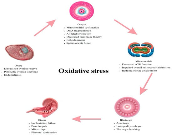 The role of ROS in female infertility in the literature is controversial, there is a paucity of literature, and further investigation is required, as its implications in male infertility were studied more often in the past []. Figure 1 shows the detrimental effects of oxidative stress on the female reproductive system.