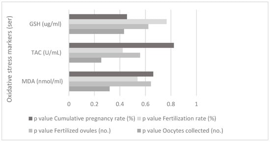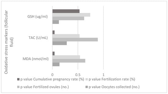 The correlations between IVF parameters and oxidative stress markers (follicular fluid) for the control group are shown in Table 5. A positive correlation was seen between MDA (nmol/mL—from follicular fluid) and cumulative pregnancy rate (%), (p = 0.009). There is also a correlation between TAC (U/mL—from follicular fluid) and cumulative pregnancy rate (%), (p = 0.006). MDA in follicular fluid is correlated with a higher oxidative stress in the environment. This, to some degree, is beneficial to the production of steroid hormones, but detrimental in high amounts. The total antioxidant capacity in the follicular fluid is positively correlated with the pregnancy rate, a marker of the follicular fluid’s capacity to maintain homeostasis between the antioxidants and ROS.