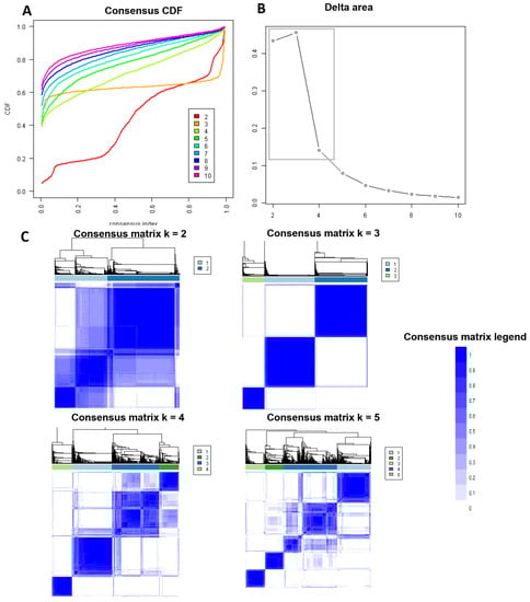 (A) CDF plot displaying consensus distributions for each k. (B) Delta area plot reflecting the relative changes in the area under the CDF curve. (C) Consensus matrix heat map depicting consensus values on a white to blue color scale of each cluster.
