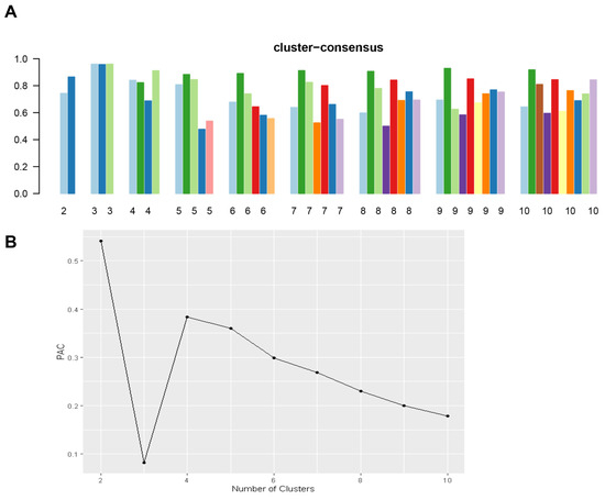 (A) The bar plot represents the mean consensus score for different numbers of clusters (k ranges from two to ten). Different colors indicate different cluster groups.; (B) The PAC values assess ambiguously clustered pairs.