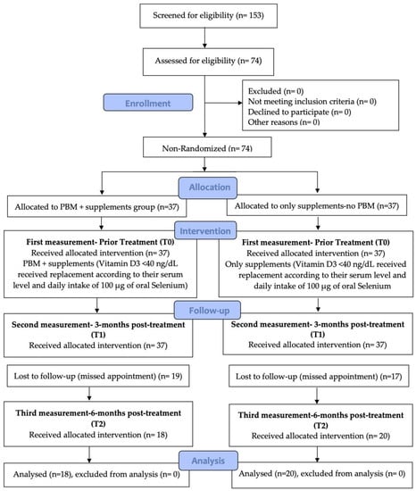 APA StyleBerisha-Muharremi, V., Tahirbegolli, B., Phypers, R., & Hanna, R. (2023). Efficacy of Combined Photobiomodulation Therapy with Supplements versus Supplements alone in Restoring Thyroid Gland Homeostasis in Hashimoto Thyroiditis: A Clinical Feasibility Parallel Trial with 6-Months Follow-Up. Journal of Personalized Medicine, 13(8), 1274. https://doi.org/10.3390/jpm13081274