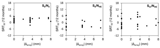 The SSD group underwent speech-in-noise tests (S0N0, S0NHE, SCINHE) pre- and post-operatively (Figure 2). Subgroup averages were calculated separately for those who received the same arrays, longer arrays, and shorter arrays (Table 4). The Kruskal–Wallis H-test did not reveal any significant differences between the group that received the arrays recommended by the 3D imaging software and the group that received shorter arrays. The group with longer arrays was not included in the analysis because insufficient data were available to provide a valid statistical comparison.