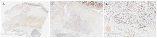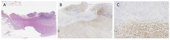 YAP-positive case 1. (A) Small-magnification section (6 mm) of YAP AT-stained gastric wall with submucosal infiltrating poorly cohesive cell carcinoma infiltrating the submucosa. (B) Detail at higher magnification (2 mm) of neoplastic cells in figure A, with nuclear and cytoplasmic expression of YAP AT involving the submucosa. (C) Higher magnification detail (300 µm) of figure B: positive neoplastic cells at the neoplastic advancement front.