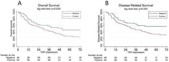 The five-year disease-related survival was significantly worse (p = 0.020) in patients with positive YAP (34%, 95% CI 22.3–45.3%) with respect to negative expression (56%, 40.3–67.0%) (Figure 3B).