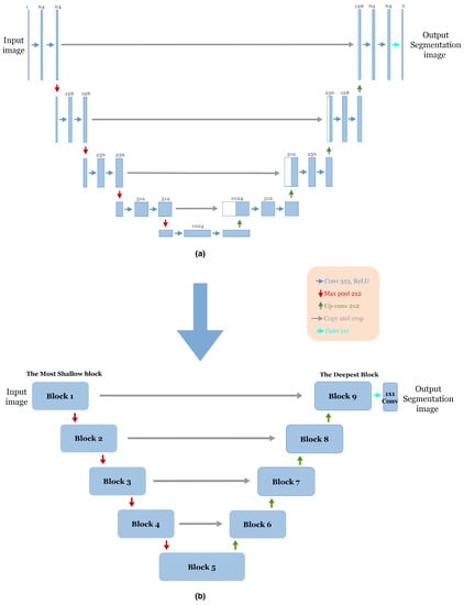 (a) The Original U-Net Architecture [12]. (b) The adopted block structure of the original U-net architecture [12].