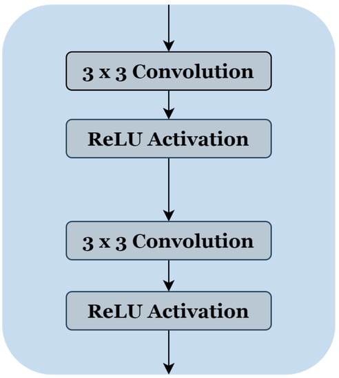 To reduce the complexity of U-Net architecture, we adopted a block structure as shown in Figure 1b. We regrouped into one block all layers between two successive maxpooling or up-sampling layers. Therefore, each block Figure 2 consists of two 3 × 3 convolution layers with a Rectified Linear Unit (ReLU) activation function. The number of blocks is similar in the down-sampling path and the up-sampling path, with one single block in the bottleneck.