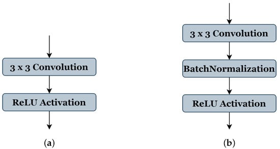 Convolution and activation layers in the original U-Net model (a), and batch-normalization layer implementations in our method (b).