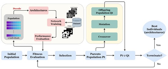 Our proposed approach GA-UNet is an iterative evolutionary technique designed to produce a progressively evolving population. The population comprises individuals, each of whom represents a distinct architecture. Each individual’s fitness is determined by evaluating the performance of the corresponding architecture in specific applications. Figure 5 and Algorithm 1 illustrate the proposed approach through a flowchart and pseudocode, respectively.