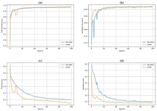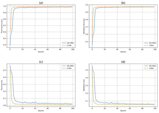 Accuracy and loss plots during training and validation phases of the proposed GA-UNet and the original U-Net [12] for the lung segmentation dataset. (a) Training accuracy plots, (b) Validation accuracy plots, (c) Training loss plots, and (d) Validation loss plots.