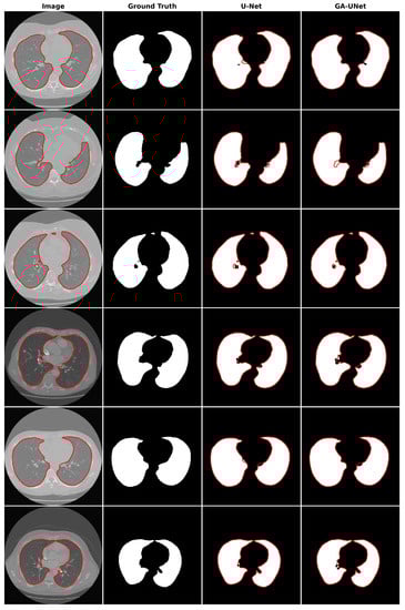 For the qualitative analysis, we show some precise and promising segmentation results in Figure 8 to visually compare our method with the original U-Net [12] model. The lung segmentation result depicted in Figure 8 is deemed satisfactory, as the proposed approach GA-UNet was able to almost completely segment the lung from the CT scan images. But in some instances, as shown in rows 2 and 4, it missed a small portion of the lung.