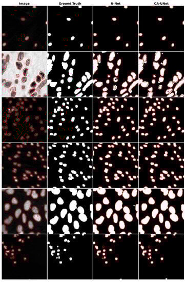 The qualitative analysis was conducted by comparing nuclei segmentation of the DSB 2018 dataset [20], regarding outcomes obtained from the proposed GA-UNet approach with those from the original U-Net [12] model, as presented in Figure 11. This figure provides a clear visual representation of the results. It is apparent from Figure 11 that the GA-UNet approach achieved near-complete segmentation of the cell nuclei of microscopy images, indicating satisfactory results. Nevertheless, in some cases (rows 2 and 6), small portions of the nuclei were missed, highlighting areas for potential improvement.
