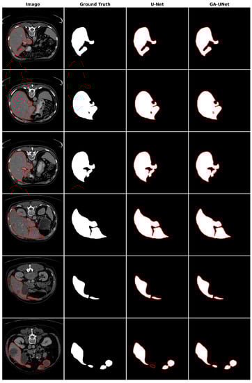 In the qualitative analysis, Figure 13 displays the liver segmentation outcomes obtained from our proposed approach, GA-UNet, compared to those from the original U-Net [12] model, providing a clear visual representation of the results. As demonstrated in Figure 13, the liver segmentation results are considered satisfactory, given that GA-UNet achieved near-complete segmentation of the livers in the scan images. However, as observed in rows 2 and 3, there were instances where a small portion of the liver was missed. On the other hand, in row 6, GA-UNet exhibited better liver segmentation performance than the original U-Net.