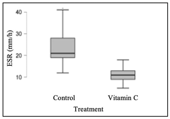 Similarly, ESR values were determined; the median for the control group was 21 mm/h (range: 12–42 mm/h), whereas the median for the experimental group was 11 mm/h (range: 5–21 mm/h). The control and experimental groups’ ESR values were found to be significantly different from one another (p < 0.001), as shown in Table 2 and Figure 2.