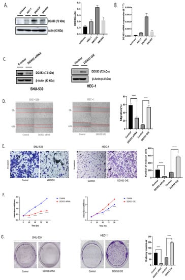 To analyze the two groups (B,D,E,G), we utilized the unpaired t-test. For the three-group analysis (F), we employed the ANOVA t-test. These tests yielded the following results: DDX53 regulation contributes to EC cell metastasis and epithelial-mesenchymal transition. (A,B) Levels of DDX53 in Ishikawa, HEC1, SNU-539, and SNU-685 cells. (C) Efficiency of DDX53 overexpression and DDX53 siRNA transfection confirmed using Western Blotting (WB). (D) DDX53’s influence on EC migration observed through wound healing assay. The right graph represents the percentage of gaps filled at 48 h compared to 0 h. (E) DDX53’s effect on EC invasion assessed using an Invasion assay. The right graph shows the count of invaded cells. (F) DDX53 effects on EC cell proliferation. (G) DDX53’s impact on EC cell proliferation evaluated through a colony assay. **** p ≤ 0.0001.
