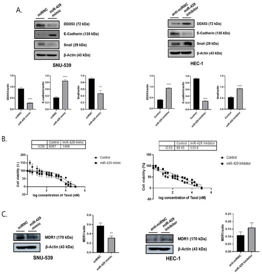 From our results, miR-429 enhanced epithelial marker levels and suppressed chemoresistance in EC cells. WB assays examining E-cadherin and Snail levels in EC cells expressing the miR-429 mimic or inhibitor showed that miR-429 upregulation in SNU-539 cells induces transformation of MET, the reverse of EMT, while miR-429 downregulation facilitated EMT in HEC-1 cells (Figure 5A). MiR-429 effects toward chemoresistance were then examined using paclitaxel (10−1–105 nM) and showed (Figure 5B) that upregulated miR-429 decreased paclitaxel IC50 values (6087 nM vs. 1458 nM), whereas downregulated miR-429 elevated values (89.45 nM vs. 533.6 nM) (Figure 5B). Our WB analyses indicated that miR-429 downregulated MDR1 levels (Figure 5C). Thus, miR-429 functions in EC may be facilitated via DDX53 targeting.