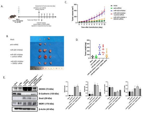 We examined miR-429/DDX53 axis effects on in vivo tumorigenesis in a xenograft tumor model. We first administered miR-429 inhibitors or anti-miR inhibitor NC and then administered control siRNA or DDX53 RNA 48 h later (Figure 6A). The mock group, which had formed tumors and received no injections, was the control group. In model animals, tumor size increased when miR-429 was downregulated. Additionally, tumor shrinkage was significantly reduced when DDX53 and miR-429 were simultaneously downregulated (Figure 6B–D). Also, suppressed miR-429 induced reduced E-cadherin and increased Snail levels (Figure 6E). However, these changes were reversed when DDX53 levels were further reduced (Figure 6E). Therefore, the miR-429/DDX53 axis may control EC tumorigenesis in our xenograft model.
