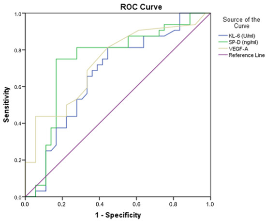 Receiver operating characteristic (ROC) curve analyses of KL-6, SP-D and VEGF-A.