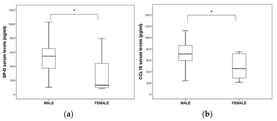 Significant differences in (a) SP-D and (b) CCL18 serum levels between male and female IPF patients (* p < 0.05).