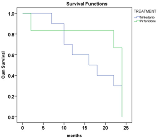 Survival analysis Kaplan–Meyer at 24 months of treatment with nintedanib and pirfenidone (log-rank, p = 0.054).