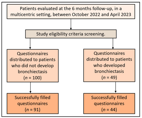 The determination of the sample size was conducted using the convenience sampling approach. The ideal sample size was projected for 97 participants, with a 5% margin of error and 95% confidence level. The set threshold for statistical significance was p < 0.05. For a type-I error rate of 5%, the statistical power was computed to be 80%. A total of 49 patients with bronchiectasis agreed to participate in the study during the surveying period. The completion of the surveys was facilitated online with the assistance of the study’s affiliated physicians. A total of 45 questionnaires were satisfactorily filled, and after excluding those with missing medical data, 44 were included in the final analysis. For the control group, 100 patients who did not develop bronchiectasis 6 months after the intervention were asked to fill out the same questionnaires. The final analysis included 91 complete answers from patients who did not develop bronchiectasis, as presented in Figure 1.