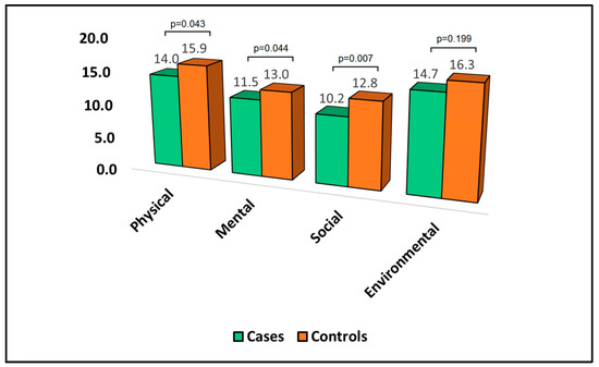 In the social domain, cases had a mean score of 10.2, which was significantly lower than the mean score for the controls (12.8), with a p-value of 0.007, suggesting a more negatively impacted social quality of life in cases, as presented in Figure 2. In contrast, in the environmental domain, the difference in the mean scores between cases (14.7) and controls (16.3) was not statistically significant, suggesting that there was no significant difference in environmental quality of life between the two groups.