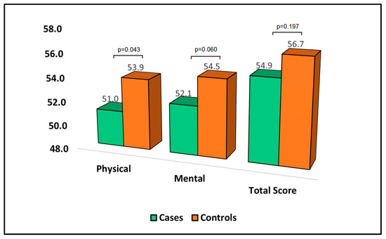 The data were analyzed using the Statistical Package for the Social Sciences (SPSS) version 26 (IBM Corp., Armonk, NY, USA). Descriptive statistics were used to summarize the demographic characteristics of the study sample, expressed as the mean ± standard deviation for continuous variables and frequencies (percentage) for categorical variables. Independent t-tests were used to compare the means of continuous variables, such as age, WHOQOL-BREF, SF-36, HADS, and PSS-10 scores, between cases and controls. The chi-squared test was used for the comparison of categorical variables between the two groups. Effect sizes were calculated using Cohen’s d to determine the magnitude of the differences between the groups. A Cohen’s d of 0.2 was considered a ‘small’ effect size, 0.5 represented a ‘medium’ effect size, and 0.8 a ‘large’ effect size. The correlation between the different health-related quality of life parameters and perceived stress was assessed using Pearson’s correlation coefficient. All tests were two-tailed, and a p-value of less than 0.05 was considered statistically significant. The data are presented as mean ± standard deviation (SD) or numbers (percentages).