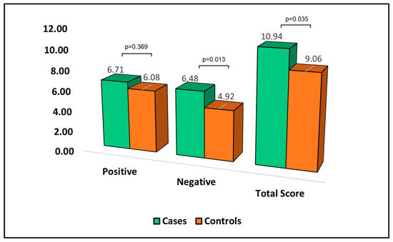 Table 7 reports the analysis of the Perceived Stress Scale (PSS-10) questionnaire at the six-month follow-up. The PSS-10 is a measure where higher scores indicate a greater degree of perceived stress. When it came to positive aspects of the questionnaire, the mean score for cases was 6.71, slightly higher than the control group with 6.08 (p-value = 0.369). In contrast, the negative dimension of perceived stress was significantly higher in cases (6.48) compared to controls (4.92), with a p-value of 0.013. This suggests that patients who develop bronchiectasis after surgery perceive their stress to be more negative than those who do not develop bronchiectasis. Moreover, the total PSS-10 score was significantly higher in cases (10.94) than controls (9.06), with a p-value of 0.035, as can be observed in Figure 5. This indicates that patients who develop bronchiectasis after surgery have a greater overall degree of perceived stress compared to those who do not develop bronchiectasis.