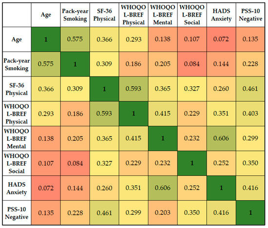 The WHOQOL-BREF Physical score had a moderate correlation with HADS Anxiety (r = 0.351), indicating that a higher physical quality of life was associated with higher anxiety scores. The WHOQOL-BREF Mental score showed the strongest correlation with HADS Anxiety (r = 0.606), suggesting that greater mental/emotional well-being was associated with higher anxiety levels. The PSS-10 Negative score showed significant correlations with SF-36 Physical (r = 0.461), WHOQOL-BREF Physical (r = 0.403), WHOQOL-BREF Social (r = 0.350), and HADS Anxiety (r = 0.416), as presented in Figure 6. This indicates that a higher degree of perceived negative stress is associated with better physical functioning, higher physical and social quality of life, and higher anxiety levels.