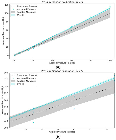The pressure was calibrated from 0 to 100 mmHg by acquiring 60 data points at each theoretical pressure and repeating this process five times. The black dotted line in Figure 4a,b is the theoretical result, the grey area represents the error allowance of ±2 mmHg from 0–20 mmHg and ±10% from 20–100 mmHg. The teal line is the fitted linear regression through the origin, and the teal-shaded portion is the 95% confidence interval. Additionally, a Bland–Altman analysis was conducted for pressure sensor calibration (Figure 4c). Bland–Altman plots, conventionally, serve to compare measurements across two methods, plotting the difference between an average of these two measurements. In this instance, there are five measurements (n = 5) to be compared. These axes display the mean difference between all five measurements (y-axis) and the mean of all five measurements (x-axis). “Mean difference between all five measurements” refers to calculating all differences between the datasets (for n = 5 datasets, this is ten differences total) and averaging those values.