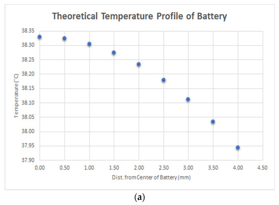 Battery safety of the 2500 mAh lithium-ion battery was mathematically modeled and experimentally evaluated. According to ISO standard 14708, the outer surface of the implanted battery cannot exceed 39 °C [13]. A 1D-shell analysis at steady state was performed utilizing the equation while charging under 3.7 V and a 0.5 A current; the surface of the battery was estimated to be just below 38 °C. One-dimensional steady state refers to temperature as a function of a single dimension or spatial coordinate, for which heat flow is constant with time [14]. The temperature profile demonstrates a negative linear relationship between the temperature of the battery and the distance from the center of the battery shown in Figure 10a; this distance is along the coordinate that measures battery thickness. Battery temperature was also evaluated through thermal imaging. The temperature of the battery was calculated while charging inside an incubator at 37 °C. The data depicted in Figure 10b demonstrates that the average temperature falls slightly above 39 °C; the industry standard falls within one standard deviation of these measurements. The design requirements for battery safety were not obtained. Considerations include the inability to mimic exact physiologic conditions within the incubator; namely, the specific heat of air differs from that of biological tissue. Additionally, continuous heat transfer in the incubator occurs through convection rather than conduction, as it would when implanted subcutaneously.