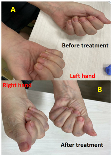 - Georgeto, S.M.; Andraus, R.A.C.; de Oliveira Júnior, E.; da Silva, R.A.; Ngomo, S.; Fernandes, K.B.P. Bilateral Idiopathic Carpal Tunnel Syndrome: Clinical-Functional Characterization and Efficacy of Two Combined Postoperative Physiotherapeutic Treatments. Orthop. Surg. 2023, 15, 1654–1663. [Google Scholar] [CrossRef] [PubMed]