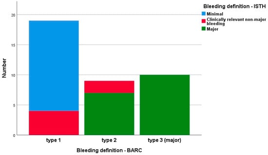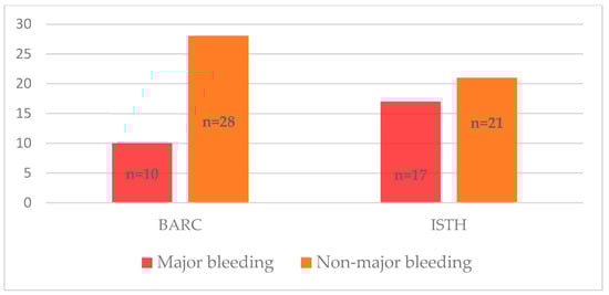 Upon completion of the observation period, major bleeding events were observed in 10 patients as per the BARC scale and 17 patients according to the ISTH scale. Such discrepancies in the number of hemorrhagic events can be attributed to the variations in bleeding categorization between the two scoring systems. Similar differences in the incidence of bleeding events, depending on the utilized scoring system, have been described in a sub-analysis of the ENGAGE AF-TIMI 48 trial [], which compared the efficacy and safety of edoxaban and warfarin in patients with atrial fibrillation. Various bleeding scales, including ISTH, TIMI, GUSTO, and BARC, were compared in this analysis. The results demonstrated that the more graded distribution provided by the ISTH scale could help differentiate the entire spectrum of bleeding, while the BARC scale could aid in identifying more severe cases of bleeding.