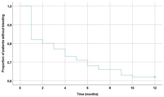 Figure 5 shows the Kaplan–Meier curve depicting the proportion of patients who had bleeding events during the entire follow-up period (12 months). Half of all hemorrhagic events occurred in the first two months after the start of combined ATT.