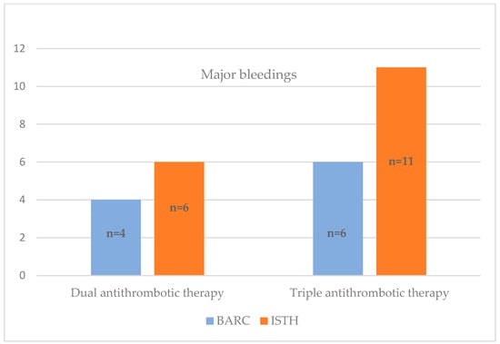 Figure 3 illustrates the distribution of bleeding occurrences in patients within 12 months, categorized by severity and based on the chosen scale. As depicted in Figure 3, the severity of bleeding measured with different scales (BARC and ISTH) significantly differed (p < 0.0001). By the end of the observation period, 10 patients had major bleeding according to the BARC scale, and 17 patients had major bleeding according to the ISTH scale (Figure 4). No fatal bleeding events were observed.